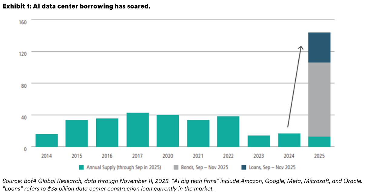 Over the last few months, artificial intelligence (AI)-related debt issuance from so-called hyperscalers (Amazon, Google, Meta, Microsoft, and Oracle) has flooded the investment-grade bond market. Historically, these firms have been largely absent from debt markets, relying instead on cash-heavy funding models for their near-term growth ambitions. As the AI race heats up, so does the debt issuance for its required development and infrastructure build. Year-to-date AI issuance has risen to over $100 billion, triple the past 10 years’ average of $32 billion annually and roughly 7% of the entire investment-grade market’s issuance thus far in 2025.