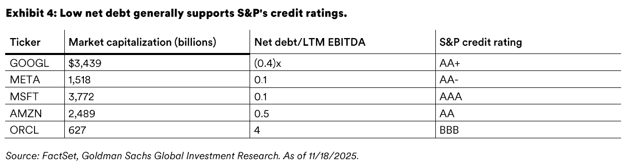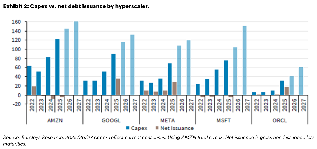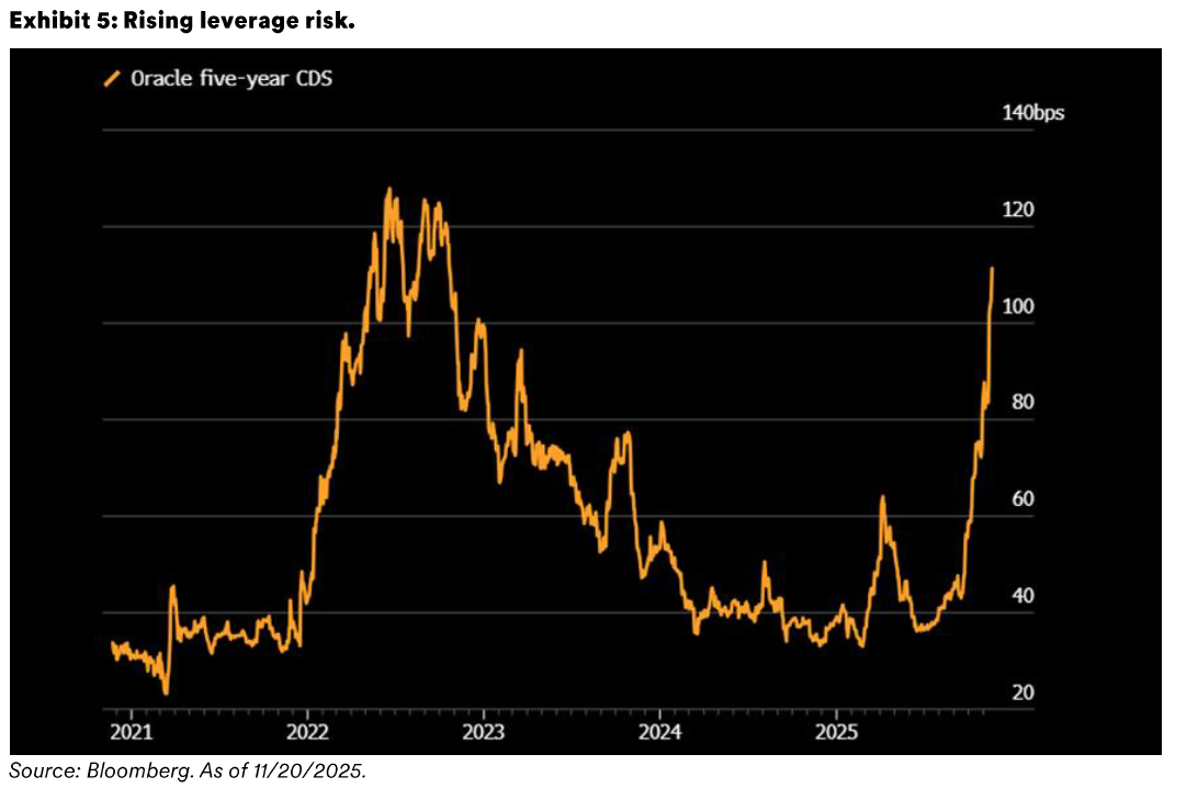 Not all hyperscalers are created equal, and while most currently have healthy balance sheets, the market has grown wary of firms like Oracle that have issued a significant amount of debt on the hope of future revenue growth (as evidenced by rising spreads for the firm’s credit default swaps, seen as a gauge for a higher likelihood that its bonds will default).