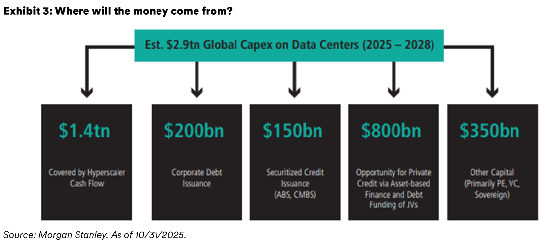 Predictions for future AI capital-expenditure (capex) spending vary, with J.P. Morgan forecasting $5 trillion in future capex, including $1.5 trillion funded from the investment-grade corporate bond market. Morgan Stanley puts the figure closer to $3 trillion in total capex, funded from a variety of sources, including the investment-grade corporate bond market. While estimates vary, the corporate debt issuance to fund AI capex will likely wind up in the hundreds of billions, if not trillions, of dollars.