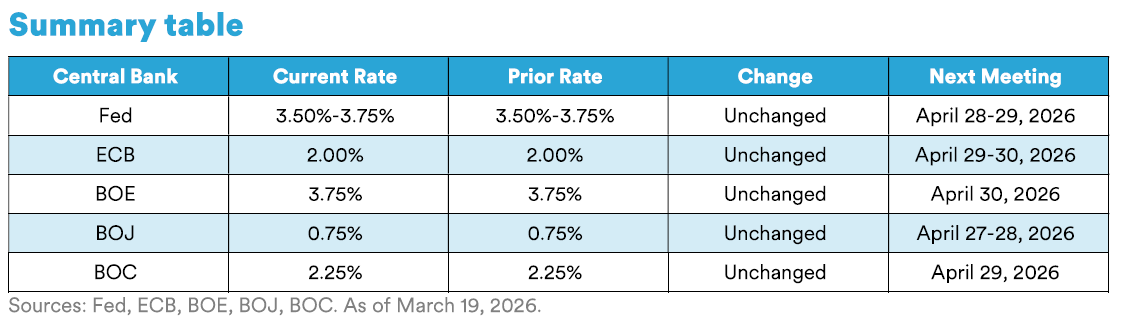 As the saying goes, "it's not easy being a central banker." With the ongoing war in Iran and a recent spike in oil prices driven by the closure of the Strait of Hormuz, a major shipping channel between the Persian Gulf and the Gulf of Oman, the task facing global monetary policymakers has become even more challenging. Inflation remains the key wildcard alongside the labor market, with headline inflation, as measured by consumer-price indexes (CPl)-particularly the volatile food and energy components-at risk of reaccelerating meaningfully should the conflict in the Middle East persist. Over time, major global central banks may also need to consider the second-order effects of higher commodity input costs flowing through to goods prices, while the outlook for tariffs remains unclear. Conversely, elevated energy prices could lead to reduced demand if higher costs are sustained. Federal Reserve (Fed) Chair Jerome Powell has announced his intention to remain on the Board of Governors until the Department of Justice investigation into the renovation of the central bank's headquarters in Washington, D.C., is fully resolved with transparency and finality. In addition, Powell will continue to serve as Chair should his nominated successor, Kevin Warsh, not be confirmed before the end of his term on May 15. We expect the Fed to remain on hold in the near term, with the voices of hawks potentially growing louder as Federal Open Market Committee (FOMC) members assess the inflationary implications of higher energy prices. The market has appropriately tempered expectations for interest-rate cuts in 2026, with pricing now reflecting less than a single cut over the course of the year. Outside of the U.S., the specter of stagflation looms larger, as the European Central Bank (ECB), Bank of England (BOE), and Bank of Canada (BOC) continue to contend with soft economic growth and elevated inflation. While each central bank elected to keep interest rates on hold during its respective meeting in March, energy vulnerabilities may ultimately lead the ECB and BOE to tighten monetary policy sooner than other developed market central banks if higher energy prices persist.