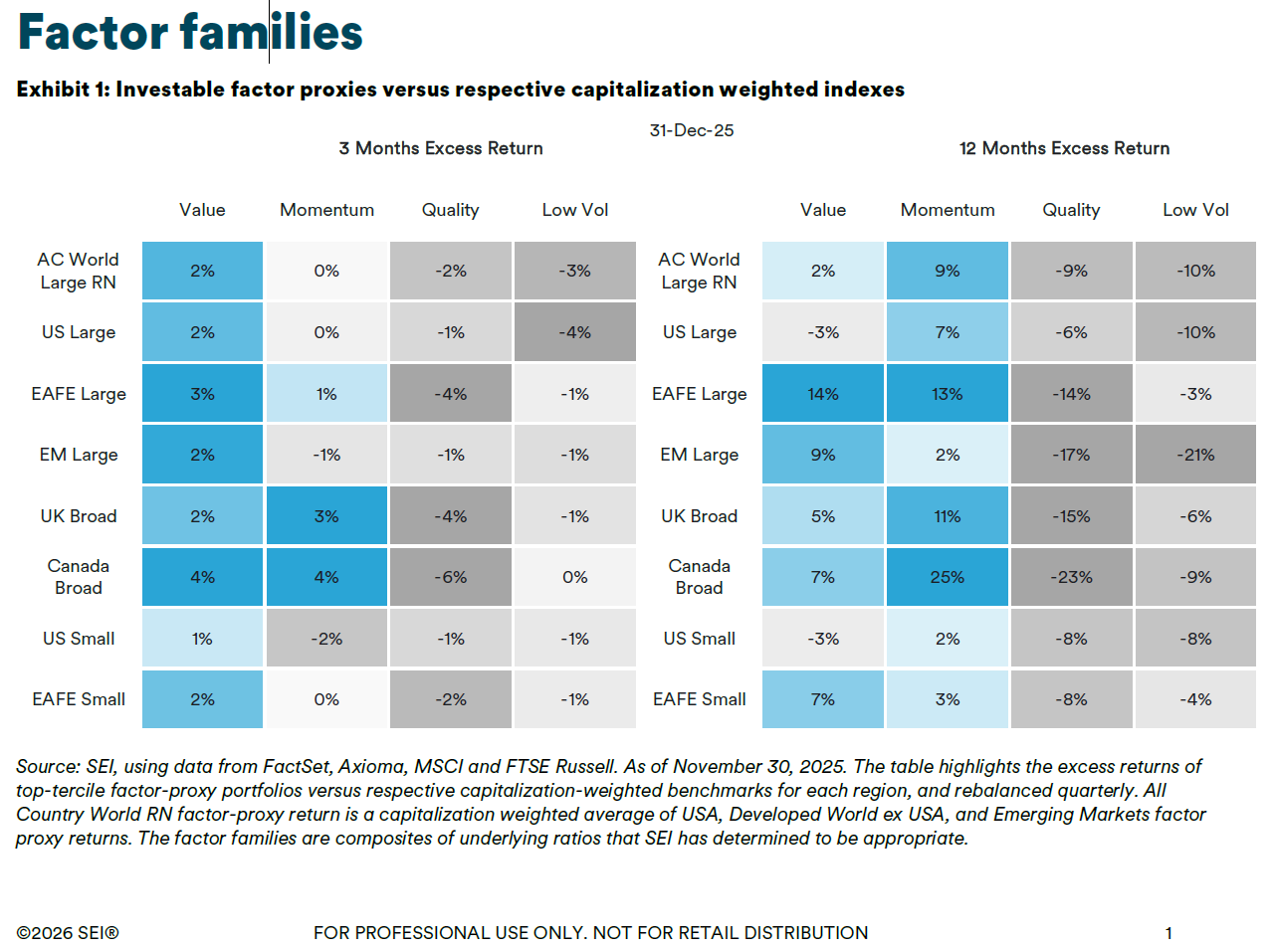This material represents an assessment of the market environment at a specific point in time and is not intended to be a forecast of future events or a guarantee of future results. Positioning and holdings are subject to change. All information as of the date indicated. There are risks involved with investing, including possible loss of principal. This information should not be relied upon by the reader as research or investment advice, unless you have otherwise separately entered into a written agreement with SEI for the provision of investment advice) nor should it be construed as a recommendation to purchase or sell a security. The reader should consult with their financial professional for more information.