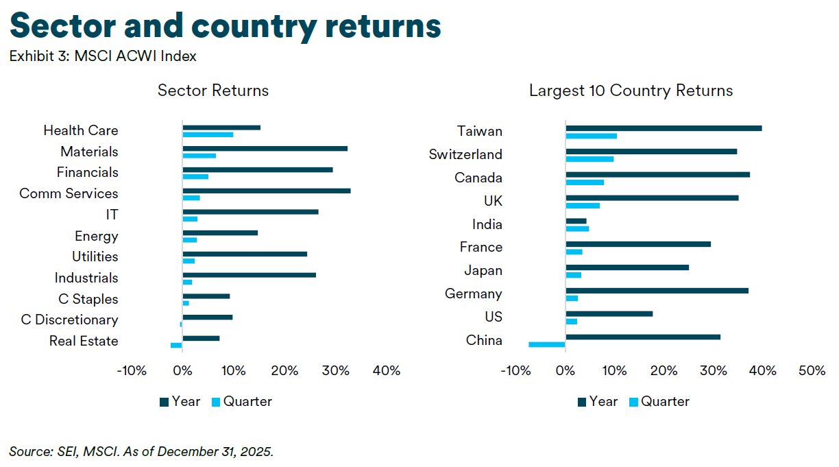 - Sector: Health Care rose on reduced uncertainty around U.S. drug pricing and a rotation away from expensive AI-linked stocks; Materials gained from a record precious metals rally, while Financials were supported by easing rate risks, lower credit concerns, and strong earnings.