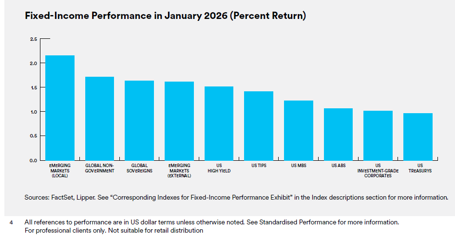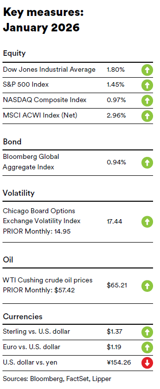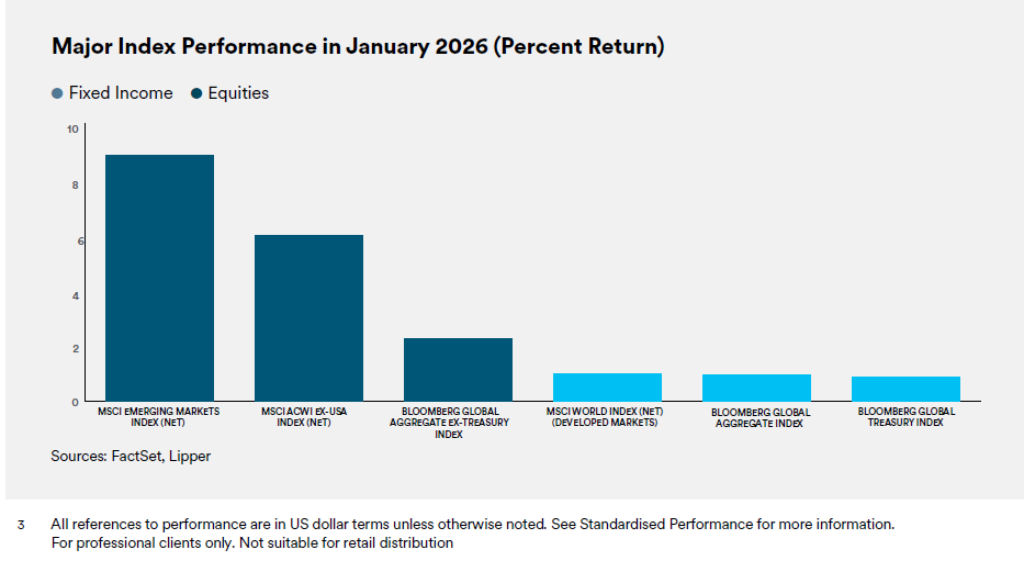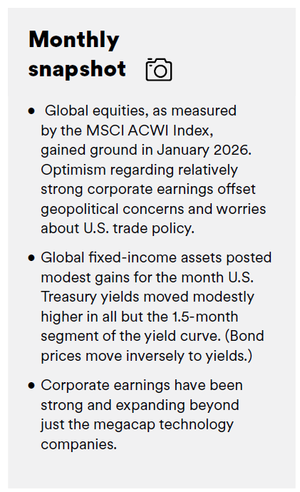 Global equities, as measured by the MSCI ACWI Index, gained ground in January 2026. Optimism regarding relatively strong corporate earnings offset geopolitical concerns and worries about U.S. trade policy. merging markets significantly outperformed developed markets for the month.