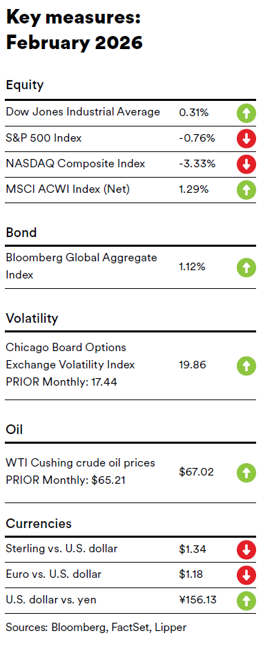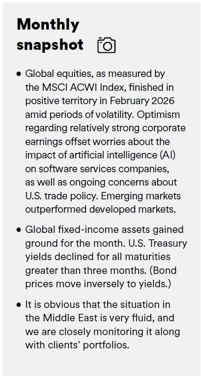 Global equities, as measured by the MSCI ACWI Index, finished in positive territory in February 2026 amid periods of volatility. Optimism regarding relatively strong corporate earnings offset worries about the impact of artificial intelligence (AI) on software services companies, as well as ongoing concerns about U.S. trade policy. Emerging markets outperformed developed markets during the month.