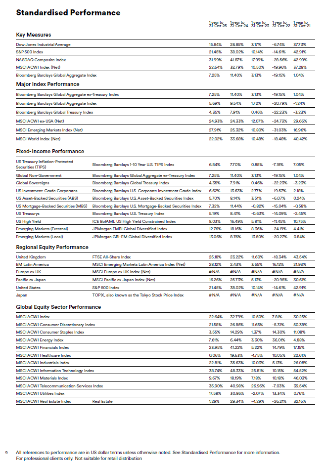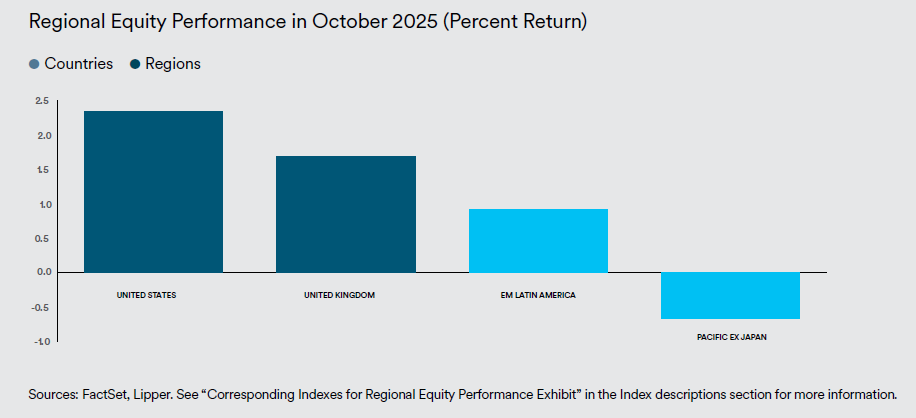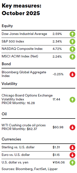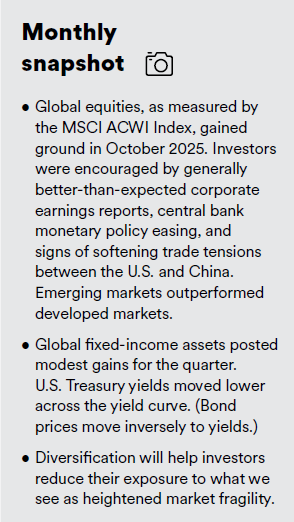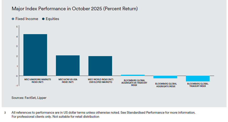 Global equities, as measured by the MSCI ACWI Index, gained ground in October 2025. Investors were encouraged by generally better-than expected corporate earnings reports, central bank monetary policy easing, and signs of softening trade tensions between the U.S. and China. Emerging markets outperformed developed markets.