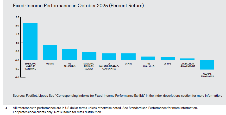 U.S. trade policy remained a focal point for global financial markets during the month. In a social media post on October 10, President Donald Trump threatened to cancel a scheduled meeting with China’s President Xi Jinping and impose “a massive increase in tariffs” on Chinese imports, accusing the Chinese government of “becoming very hostile, and sending letters to Countries throughout the World, that they want to impose Export Controls on each and every element of production having to do with Rare Earths [a group of 17 metals that are used in the production of electronics such as smartphones, computer hard drives, and big-screen televisions]…”However, Trump and Xi met in South Korea toward the end of the month and reached a tentative trade deal in which the U.S. agreed to reduce tariffs on imported goods from China from 57% to 47% in exchange for China’s pledge to curb the export of chemicals used to produce fentanyl. Additionally, Xi agreed to a one-year suspension of export controls on rare-earth minerals, and China will end its embargo on soybean imports from the U.S.