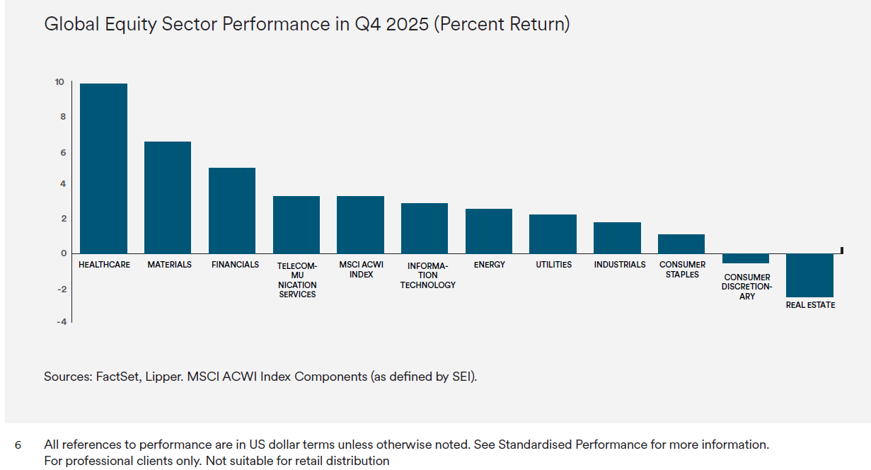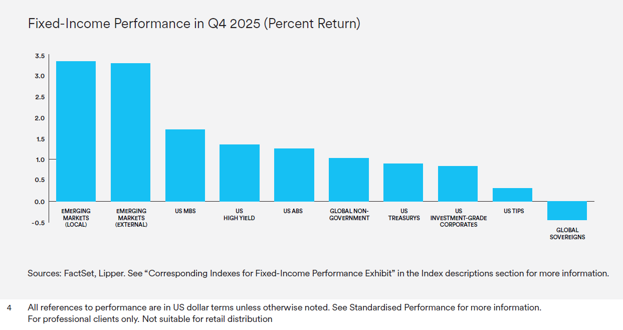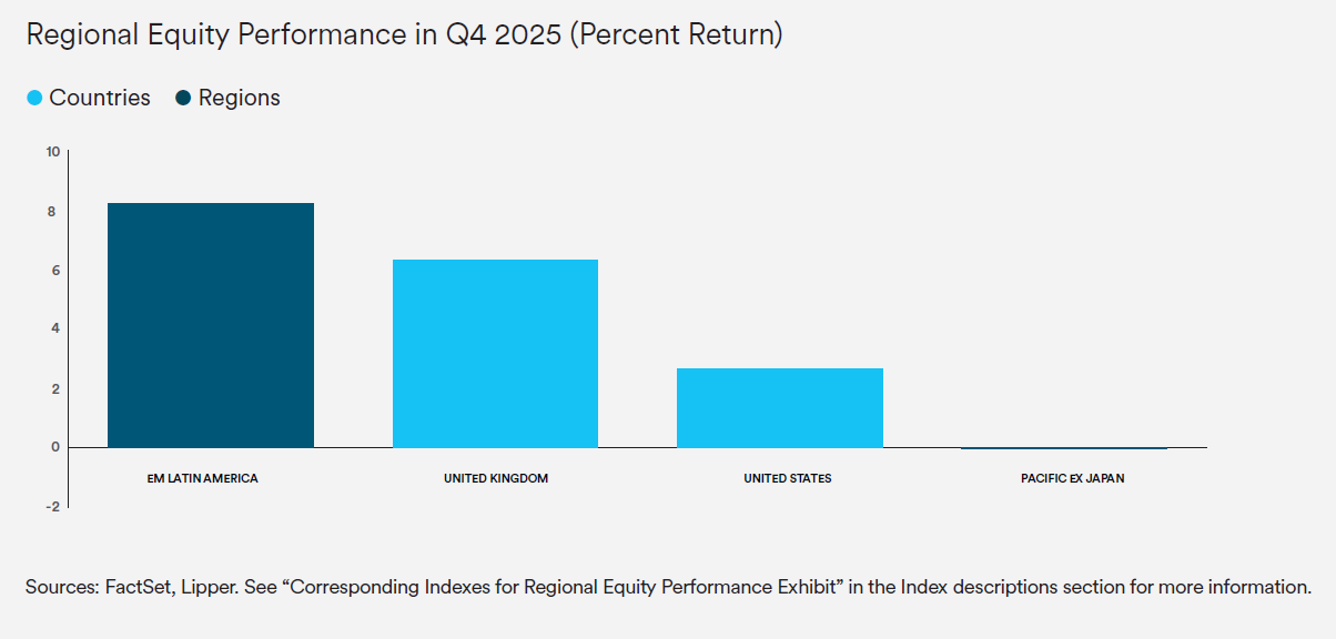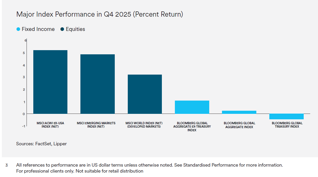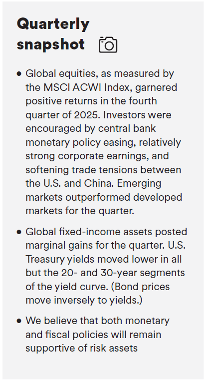 Global equities, as measured by the MSCI ACWI Index, garnered positive returns in the fourth quarter of 2025. Investors were encouraged by central bank monetary policy easing, relatively strong corporate earnings, and softening trade tensions between the U.S. and China. Emerging markets outperformed developed markets for the quarter.