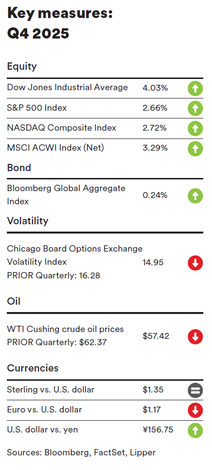 Equity markets capped off a stellar year with a positive fourth quarter. Earnings continued to broaden, monetary policy continued to ease, and artificial intelligence (AI) hyper scalers continued to spend. Heightened volatility was also a theme to close out the year as data-center debt financing raised AI bubble concerns, and the U.S. government shutdown left both policymakers and investors a bit in the dark on the state of the U.S. economy.