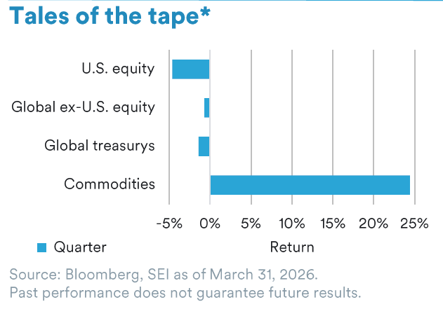 *Tales of the tape: U.S. equity: S&P 500 Index; Global ex-U.S. equity: MSCI ACWI ex-USA Index; Global Treasurys: Bloomberg Global Treasury Index; Commodities: Bloomberg Commodity Index.