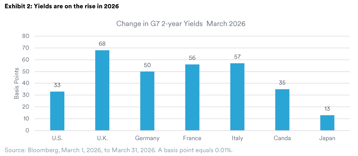 Fixed-income markets were particularly volatile in March as front-end yields sold off dramatically on inflation concerns from rising energy prices and expectations for tighter monetary policy. U.S. market expectations at the start of the year were for two full interest-rate cuts in 2026, which have now been fully priced out. Elsewhere, investors now expect multiple rate hikes, including from the Bank of England and European Central Bank. We view the severity of this move in yields to be a bit overdone as it will not be lost on monetary policymakers that higher overnight rates cannot open the Strait of Hormuz. Nonetheless, with inflation above most targets and rising, we do expect most central banks to adopt a more hawkish stance in the near term. Two-year yields look attractive at these levels, particularly in the U.S. We remain positioned for lower short-term rates on our expectations for less restrictive monetary policy than is currently priced in and positioned for neutral-to-higher long-term yields as the debt situation will only worsen with the onset of war.