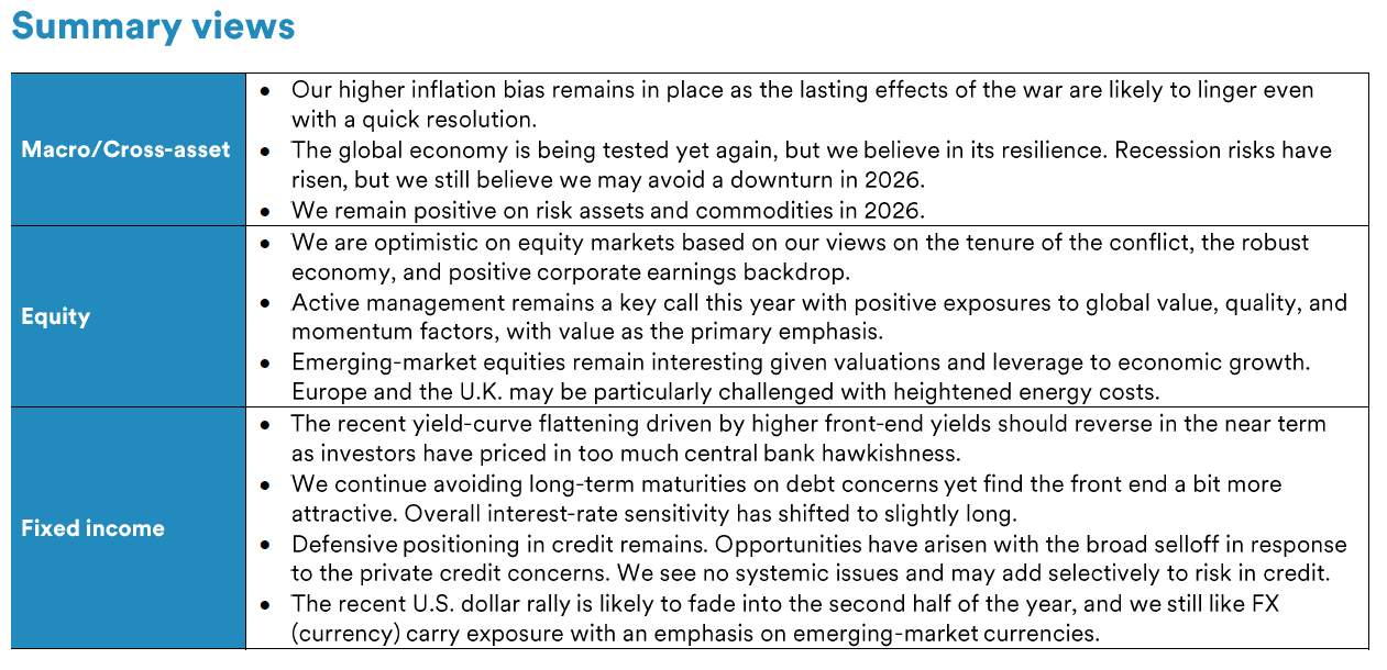 We remain constructive in our outlook for equities given our current views, including a near-term resolution to the conflict and the continued resilience of the economy and corporate earnings. Our strongest preference remains active management given the fluid situation in the Middle East and higher levels of stock-level dispersion. A value-oriented approach is a particular emphasis, and we expect continued outperformance for the remainder of the year. In addition, we still find emerging markets particularly attractive based on valuations and overall leverage to what we see as a still-growing global economy. Meanwhile, the current tensions raise the most concerns in Europe given the potential for an outsized economic impact from rising energy costs.