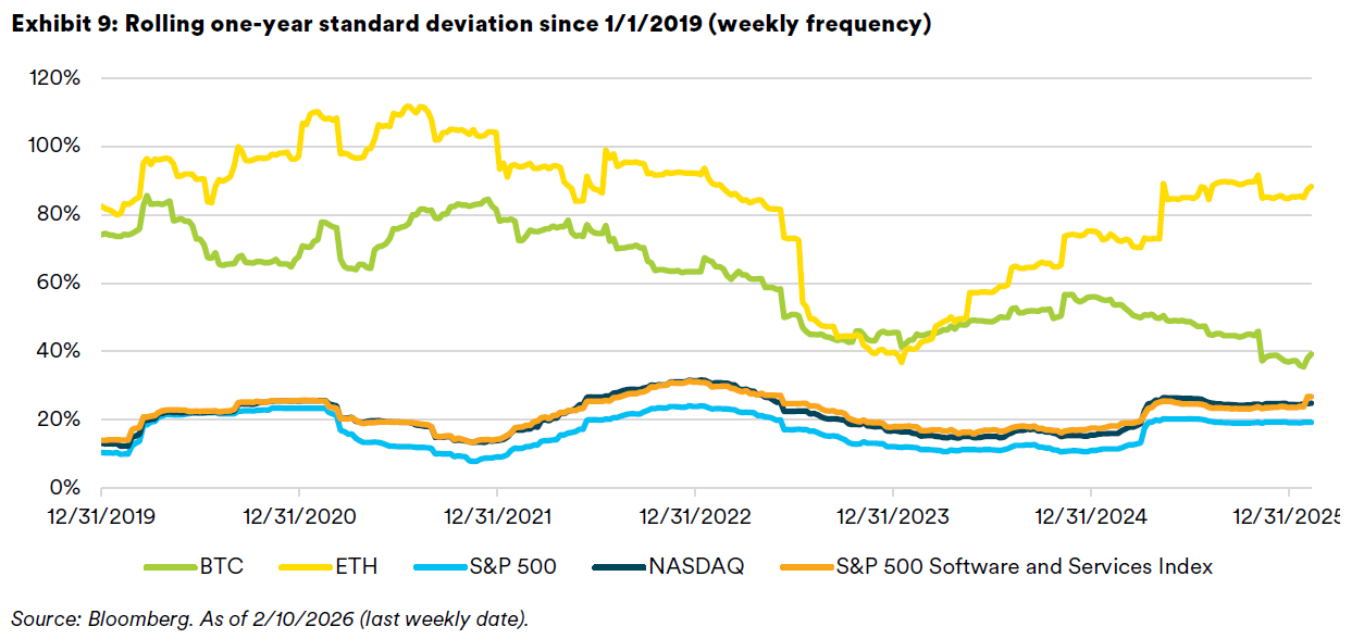 The last few weeks have demonstrated that volatility doesn’t always come all at once. Sometimes it comes in waves without a clean narrative to tie it together: software gets hit, then it’s the megacap artificial-intelligence (AI) complex’s turn, and all the while cryptocurrency (crypto) is down sharply. Big moves, sudden reversals, and quickly shifting correlations—this is what a high-volatility environment can look like. In this piece, we examine what’s been happening across software as a service (SaaS) companies, the Magnificent 7, and crypto, and why the volatility is likely to continue.