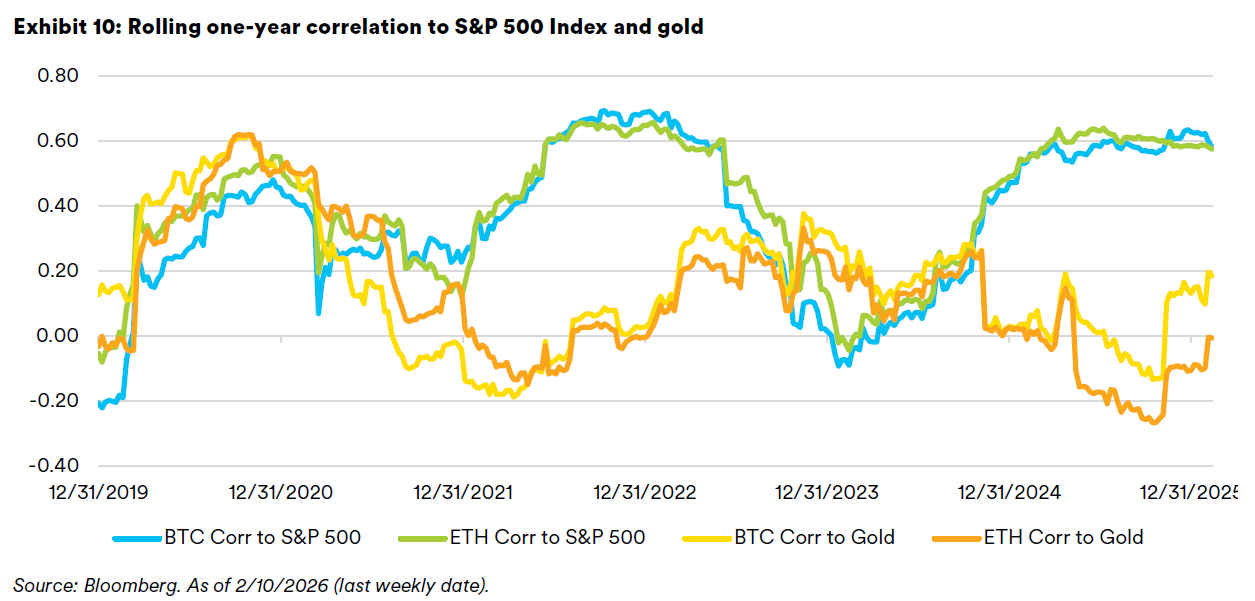 Diversification can be conditional. When correlations rise, the expected diversification benefits of less-correlated assets shrink. There are times when crypto assets such as bitcoin and ether are highly correlated to U.S. large-cap equities. Meanwhile, the narrative around bitcoin being digital gold has not held up empirically over the past couple years.