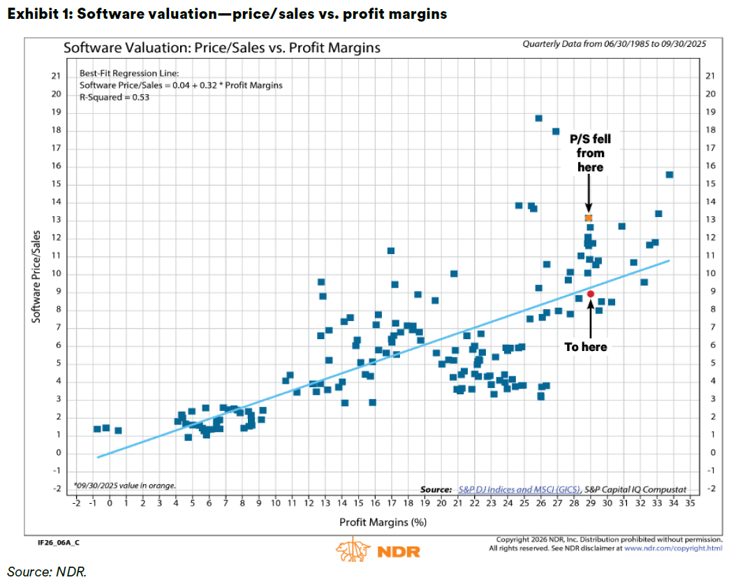 Software companies are making the shift (e.g., Salesforce’s Agentforce), but there are also more structural concerns: if AI agents interact with software more than humans, the interface potentially matters less. Should this occur and well-designed front ends matter less, this could raise the risk of commoditization and make it easier for firms to build certain tools in-house using AI coding. Exhibit 1 highlights how software company valuations have improved and are potentially closer to fair value (though if margins compress, these valuations are likely still too high).