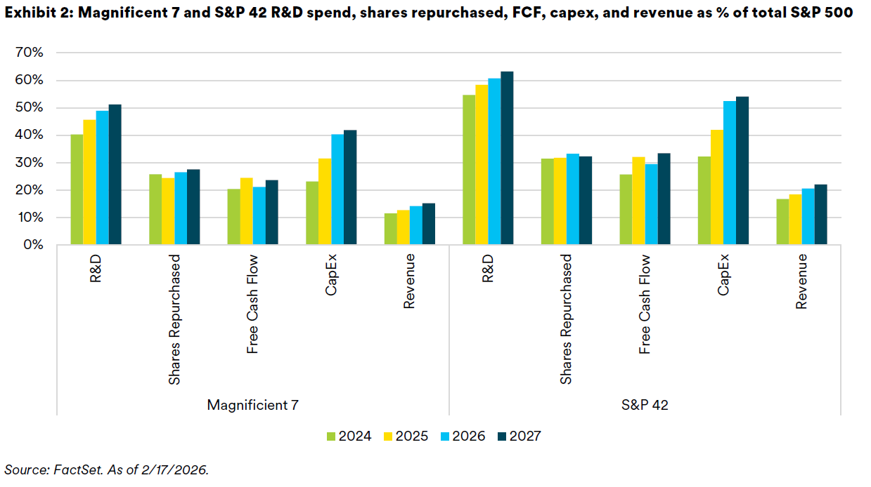 When we look at the Magnificent 7 and the S&P 42 (42 stocks selected by JPMorgan Asset Management driving the bulk of the S&P 500 Index’s AI-related earnings and infrastructure growth), we see that R&D spending as a percentage of total S&P 500 R&D spend is high and increasing, as well as capex. The S&P 42 is expected to represent over 60% of R&D spending by 2027, over 50% of S&P 500 capex, and 33% of all S&P 500 Index free cash flow.