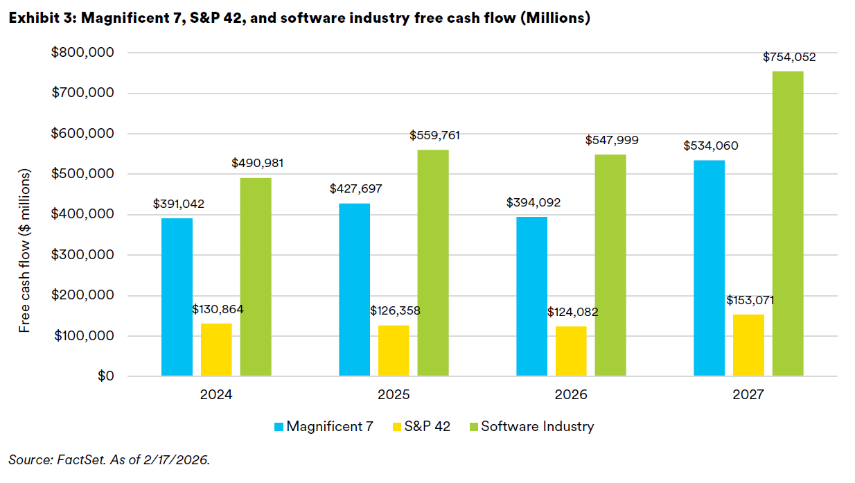 One reason the recent drawdown in software shares has felt unusually severe is because it wasn’t a reaction to near-term earnings misses. The launches of Anthropic’s Claude Cowork, open-source OpenClaw, OpenAI’s Codex, and agentic plugins were a potential catalyst, reigniting a debate over whether AI agents could reduce the need for traditional per-seat software licenses. If workflows that used to require teams of people can be automated, it naturally raises concerns about the existing business model; fewer people translates to fewer seats, putting pressure on profitability. Similar to their historical move from license-based pricing to seat-based pricing, software companies will need to shift from seat-based pricing to outcome- or usage-based (consumption) pricing (i.e., charging by the number of AI conversations).