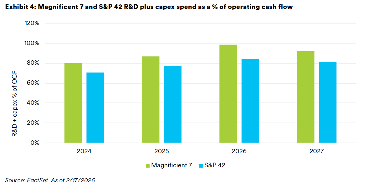 The so-called investment impulse, which effectively measures the degree to which a company reinvests cash from operations into R&D and capex, is increasing and expected to peak in 2026 as demand to build out the necessary research and infrastructure for AI-related investments continues. We see the investment impulse of the Magnificent 7 approaching 100% in 2026.