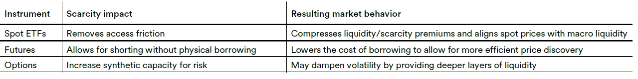 Crypto’s market structure is also changing. As crypto becomes easier to access (and hedge), the asset can lose part of its scarcity premium4 over time―not due to a reduction in scarcity, but because it becomes easier to express exposure through more wrappers (spot products like ETFs, futures, and options). This dynamic can pull crypto prices closer to broader macro liquidity conditions and, in certain periods, make crypto behave more like a high-beta risk asset than a standalone diversifier. As access improves, the scarcity premium can compress and price behavior begins to track broader liquidity conditions more closely. More institutional access doesn’t always translate into less volatility; sometimes it means more ways to buy and sell quickly, with leverage, which can amplify moves in both directions. Access can reduce structural premia while increasing short-horizon flow sensitivity. The table below highlights how different structures can affect market behavior.