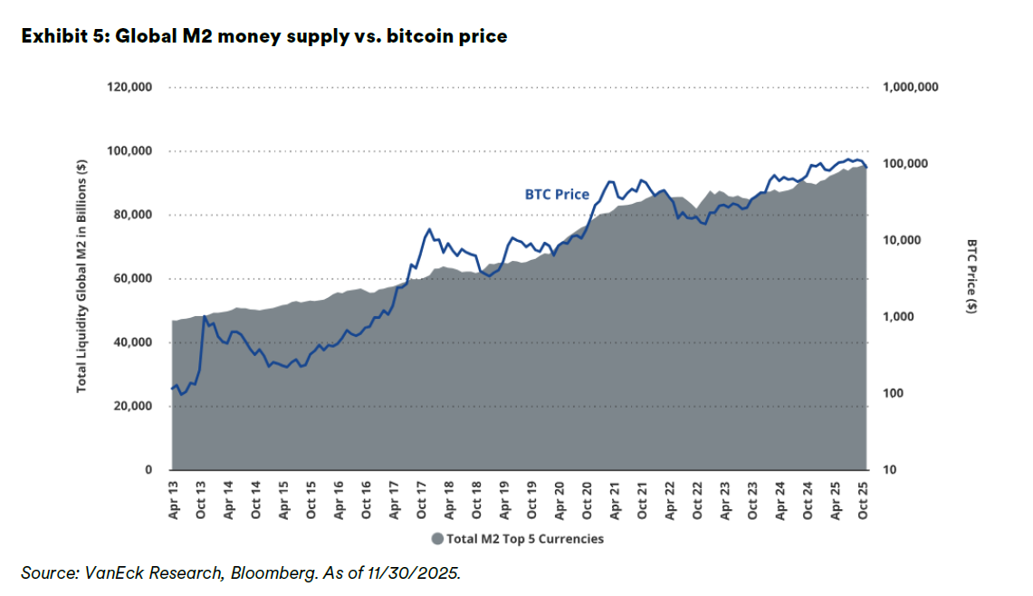 VanEck’s Digital Asset Research team has been focused on bitcoin as a “liquidity sponge,” finding that changes in global M2 money supply explain some of bitcoin’s price variance.5 Easier access and fewer restrictions allow investors to take increasingly risky bets in bitcoin and other crypto assets as liquidity in markets increases.