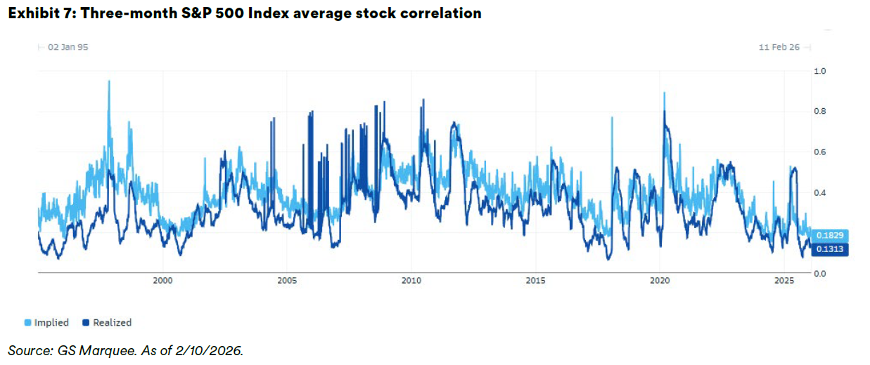 Increased gross exposure means higher degrees of leverage, while increased net exposure means higher degrees of directionally long risk. When volatility rises, triggering risk limits, the alpha trades at these pod shops can unwind quickly. The higher the leverage, the quicker the unwind. The more directionally long the leverage (higher net exposure), the sooner risk limits will be hit when markets start to draw down. Since the alpha trades at these pod shops tend to have low correlation with the general market, even during de-risking, these unwinds can create sharp moves without correlations going to 1 (i.e., perfect positive correlation). Correlations, especially intra-equity correlations (e.g., stock-to-stock in the S&P 500 Index), often spike amid large drawdowns. However, as Exhibit 7 highlights, the most recent selloff did not lead to a spike in correlations (implied or realized).