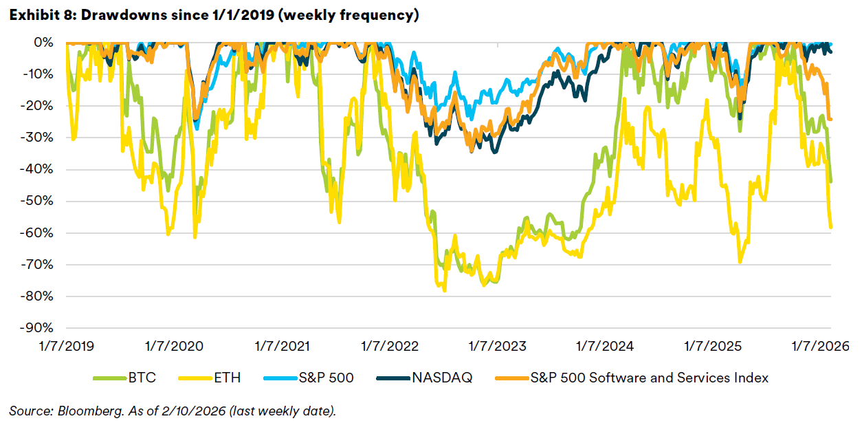 In periods of market stress, different assets can move in the same direction even when the underlying causes differ. It’s worth noting the severity of the drawdown of the two largest crypto assets by market capitalization relative to public U.S. equities.