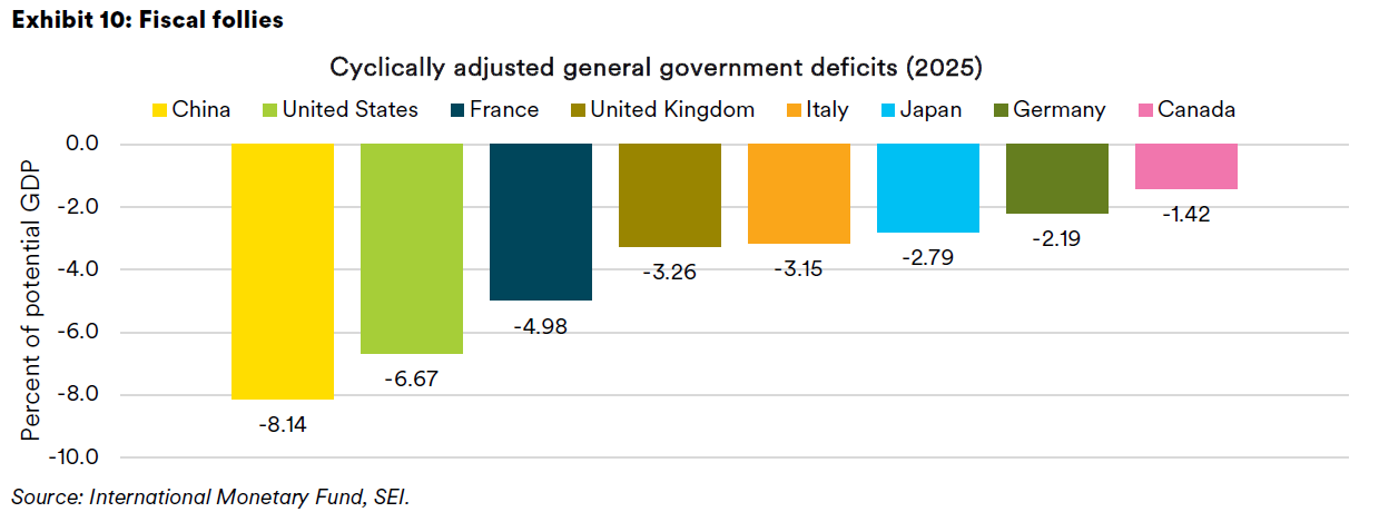 Forecasting an expansive fiscal policy for the major economies is the easiest call to make. We did so for 2024 and for 2025 and were not disappointed. SEI is making the same call for 2026, only this time we believe government fiscal policy will be even more expansive. This time last year we noted that the election of Donald Trump and the Republican victories in the House of Representatives and Senate guaranteed the extension of most tax cuts embodied in the 2017 Tax Cuts and Jobs Act (TCJA). We also expected several campaign promises to be enacted, including the elimination of taxes on tips and overtime, tax relief for pensioners, and an easing of the deductibility limit on state and local taxes. The so-called One Big Beautiful Bill Act included all these items plus business breaks in the form of generous rules for depreciation and tax deductions on research and development (R&D) and capital expenditures.