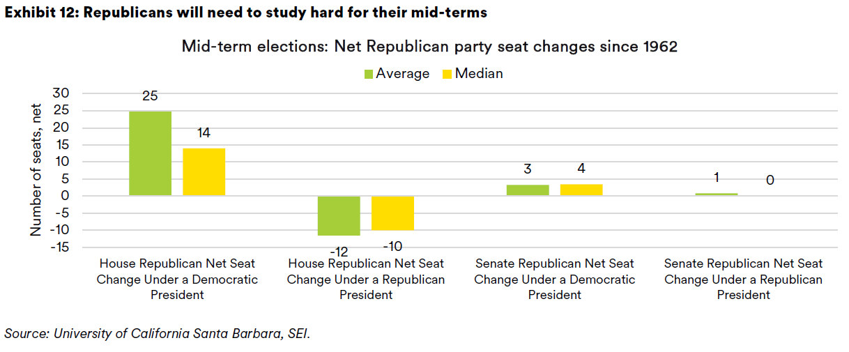 None of the above is expected to have a major market impact, although the oil markets could turn more volatile if further sanctions are placed on Russian oil or the occupation of Venezuela takes a bad turn. Investors may instead pay more attention to the political calendar. The U.S. holds mid-term elections in November. All 435 seats in the House of Representatives and 35 of the 100 Senate seats are up for election (including two special Senate elections to fill unexpired terms). There are also 39 state governor positions to be contested. Their slim majority in the House suggests that the Republicans will have difficulty maintaining control of that chamber. The sitting president’s party historically loses seats in the mid-terms, as illustrated in Exhibit 12. The recent off-year elections were likely a wake-up call for the Republican Party; their gubernatorial candidates underperformed in Virginia and New Jersey, while lower-level elected positions also swung decisively toward the Democrats. Affordability, inflation, and healthcare expenses are currently the major issues influencing the electorate. President Trump’s approval ratings are also quite low. While the mid-term elections are still 11 months away, the early read is not a positive one for the Republicans. Democratic control of the House can be expected to lead to policy gridlock and constant clashes with the Trump administration.