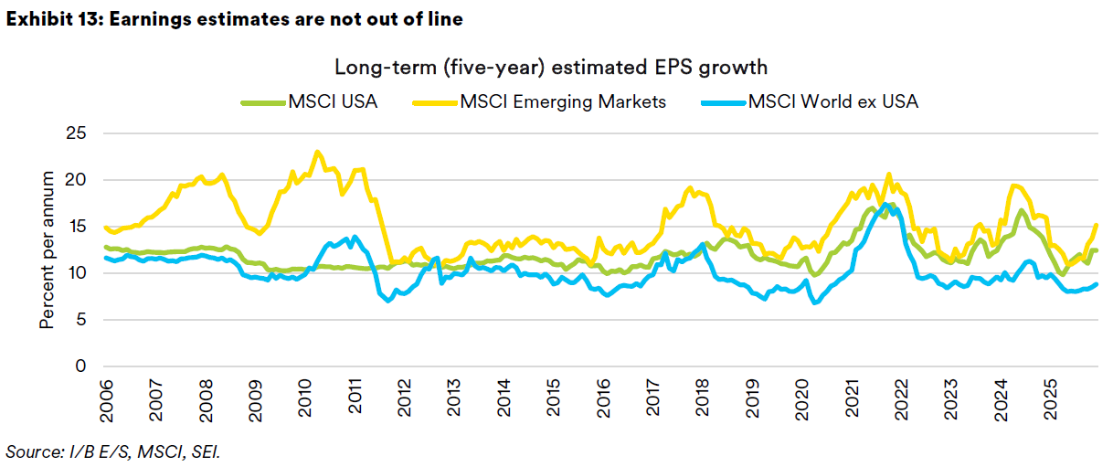 Beyond the S&P 500 Index, valuations remain far more reasonable. The S&P MidCap 400 Index and the S&P SmallCap 600 Index have forward P/Es of 16.3 and 15.5, respectively. Both are well within the historical range of the past two decades. The same goes for international equities. The MSCI World ex USA Index trades at a 15.7 P/E multiple while the MSCI Emerging Markets Index has a forward P/E ratio of 13.5. The P/E multiple discount of international stocks versus those of the U.S. has narrowed somewhat this year but is still substantial. Of course, U.S. growth in earnings has been phenomenal, and analysts are willing to forecast a continuation of 12.5% growth annually over the next five years. By contrast, analysts’ long-term growth estimates for the companies that comprise the MSCI World ex USA Index remain quite subdued, nearing the lowest levels since the pandemic with a reading of 8.9%. The estimated long-term earnings growth rate for emerging markets has rebounded this year; the Institutional Brokers' Estimate System’s (I/B/E/S) estimates for the next five years are pegged at 16.5% and rising. As highlighted in Exhibit 13, long-term earnings-per-share (EPS) growth estimates do not seem unreasonably optimistic relative to the past two decades.