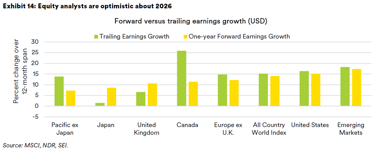 As we highlight in Exhibit 14, security analysts expect U.S. EPS to grow by 15.2% over the 12 months ended December 2026 versus a reported EPS gain of 15.6% for the trailing 12-month period. Japan and the U.K. are expected to show the biggest improvement (measured in U.S. dollars). Forward earnings in emerging markets should remain healthy with an estimated gain of 17.3%, albeit a slight deceleration from the 12-month advance posted in over the trailing 12 months ended December. Apart from companies that comprise the MSCI Japan Index and the MSCI Pacific ex-Japan Index, other regions are predicted to post double-digit earnings growth in 2026 versus the past year.