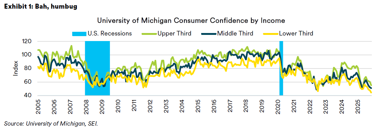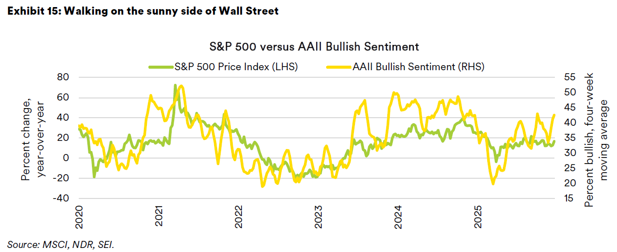 Other measures of investor sentiment also provide a mixed picture. Technical and investor sentiment signals that are in neutral territory include the equity put-to-call ratio, the net position of traders in S&P futures (large speculators are notably bearish, while small traders are moderately bullish), and short interest as a percentage of daily trade volume on the New York Stock Exchange. On the negative side, volatility across different assets—stocks, bonds and foreign exchange—is notably low, indicating a high degree of investor complacency. However, with benign financial conditions and robust earnings growth, there is probably more life left in this “old bull” as we head into 2026. To get insights into SEI’s investment positioning, please read Chief Investment Officer Jim Smigiel’s SEI Forward report.