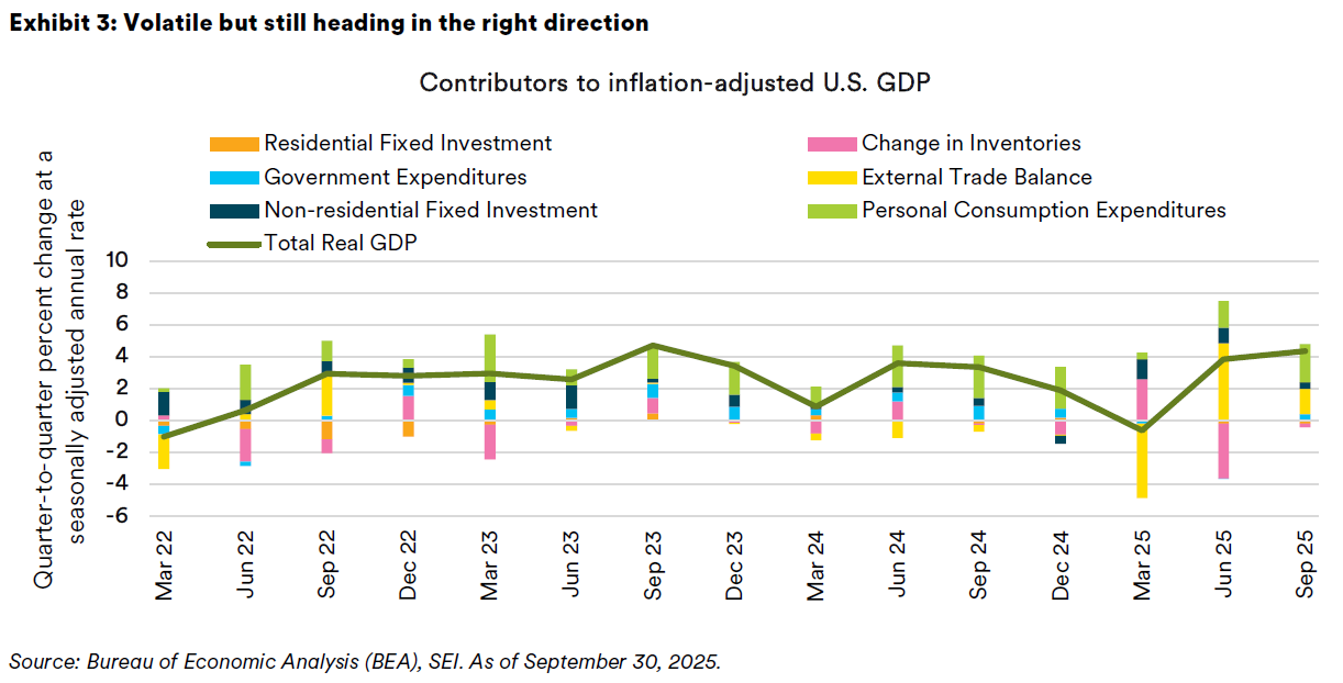 Several factors powered U.S. outperformance: Consumer spending remained solid, thanks to the baby boomers and other affluent households that have benefited from the surging value of their investment portfolios. Business investment also was a major driver—particularly in technology and infrastructure related to artificial intelligence (AI). The nation’s tech giants unleashed a capital expenditure boom to build out AI data centers and all that goes with them, including semiconductors and software. This “AI tsunami” of spending contributed significantly to U.S. GDP, even as higher interest rates and tariff-related uncertainty depressed capital spending in other industries. Exhibit 3 tracks the contribution to GDP growth of the major components on a quarter-to-quarter basis at an annual rate. Note that the two most volatile components of U.S. GDP this year have been the trade sector (exports minus imports) and the change in inventories; both reflect the impact of the sharp shifts in trade policy from one quarter to the next.