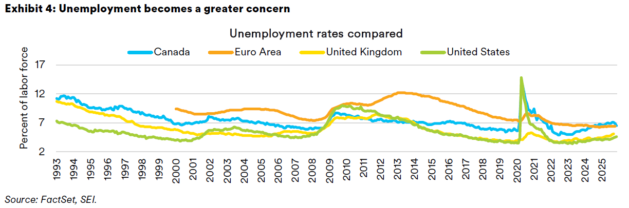 Labor markets. Labor markets in 2025 stayed relatively tight by historical standards, although there were signs of cooling that we did not anticipate at the start of last year. As we highlight in Exhibit 4, the unemployment rate in the U.S. increased from a 54-year low of 3.4% in early 2023 to a four-year high of 4.6% in November 2025. Despite increasing by more than one percentage point, joblessness remained notably low compared to past norms (the U.S. jobless rate averaged 5.7% in the 2010s). Similarly, the U.K. saw its jobless rate move up from 3.6% in mid-2022 to 5.1% as of September this year. Eurozone unemployment has held steady at 6.4%, just off the record low for the regional bloc. By contrast, Canada’s unemployment rate jumped markedly, reaching 7.1% in August and September before moving back to 6.9% in October and 6.5% by November. Complicating the country’s weak employment growth is the fact that Canada’s labor force has expanded dramatically on record immigration and 7% population growth since 2022. Job creation simply couldn’t keep up; the rising rate reflects an excess of workers adding to this year’s tariff-related economic stress.