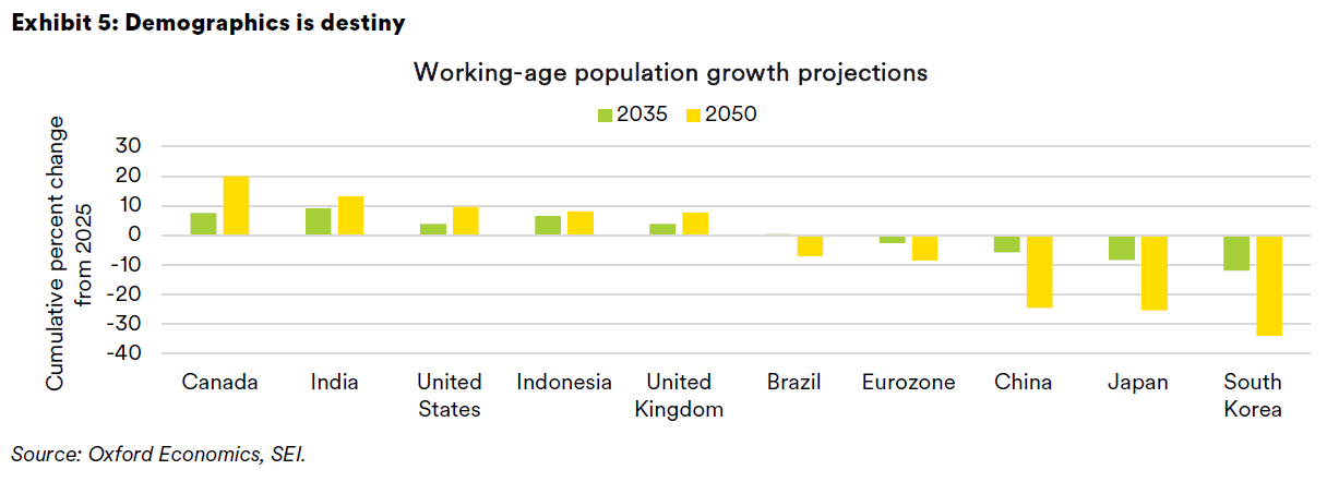 - Demographic shifts: By 2050, major economies, including China, Japan, and South Korea, will see significant declines in their working-age populations, while the U.S., U.K., and Canada are expected to register gains—assuming continued immigration and stable fertility rates.
