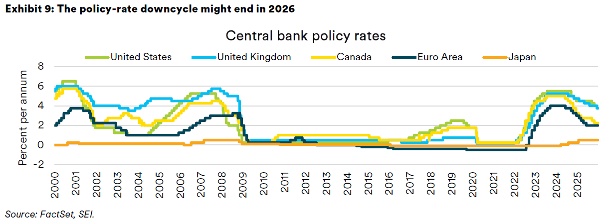 The conduct of monetary policy in 2025 mostly followed SEI’s expectations, with all major central banks except Japan engaging in multiple policy-rate reductions. We agreed with the Federal Open Market Committee’s (FOMC) assessment at the time that the federal funds rate would fall from a beginning-of-the-year level of 4.5% to about 4%. Following December’s reduction, the federal funds rate starts the new year in a range of 3.50% to 3.75%. We thought there was a chance that the Fed would not need to reduce the funds rate at all in 2025; it did drag its feet in doing so until September, intense rhetorical pressure from President Trump notwithstanding.